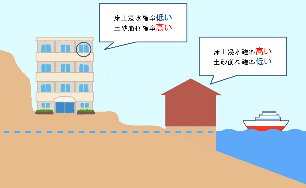 『水災』の補償は、大雨や洪水等による「床上浸水」や「土砂災害」を補償するものになりますが、高台の家やマンションの2階以上であれば